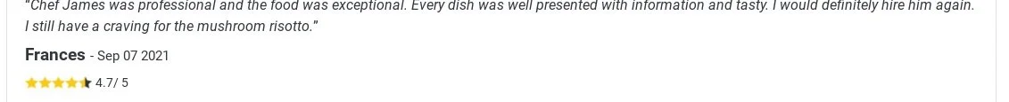 Chef James Richmond, a California Culinary Academy graduate and Sonoma County resident, brings a lifelong passion for food and extensive high-end restaurant experience to his private chef and catering services. His culinary journey, ignited in his grandmother's kitchen, has spanned esteemed establishments like Maison, Terra Plata, Restaurant Mirepoix, and Bistro Jeanty, and under the mentorship of renowned chefs Patrick Albert, Matthew Bousquet, Tamara Murphy and Philippe Jeanty. James's culinary philosophy is grounded in local, sustainable, and organic ingredients, showcasing the best of California's wine country with seasonal, farm-fresh menus. His expertise extends beyond French cuisine to encompass Italian and modern techniques, a versatility refined through global culinary exploration in France, Italy, Europe, and other renowned culinary destinations.From elegant dinner parties featuring hand-made pastas and locally-sourced proteins to sophisticated wine pairings with delicate hors d'oeuvres, Chef James Richmond crafts personalized dining experiences that reflect his commitment to quality, sustainability, and culinary artistry.